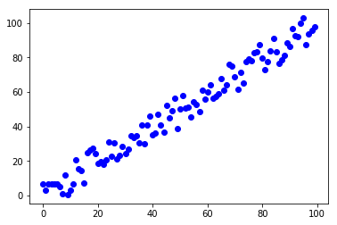 A simple vista observamos claramente el comportamiento lineal de la función que queremos estimar. En este caso particular tenemos 100 observaciones, es decir 100 pares de datos